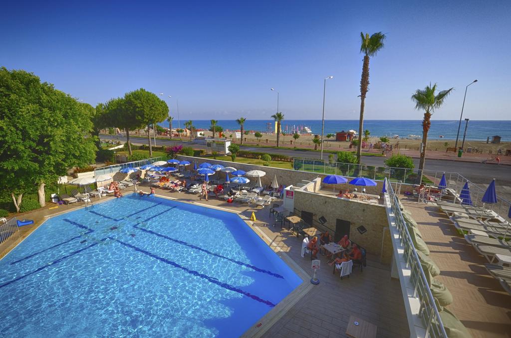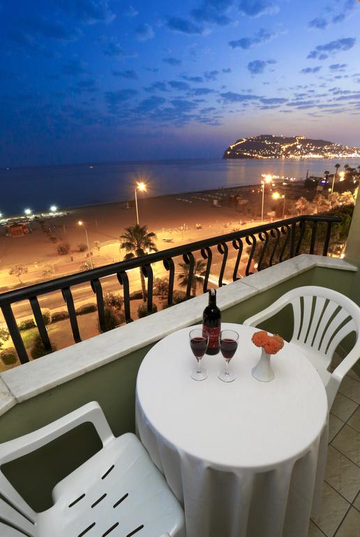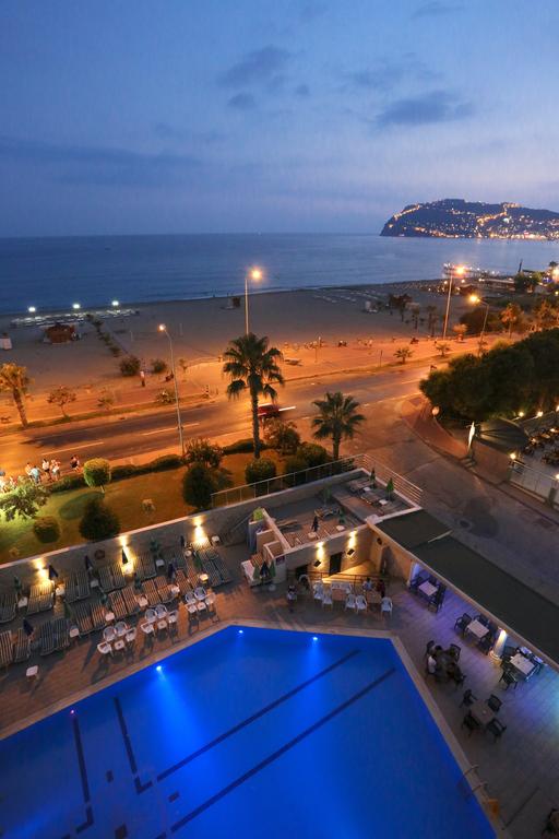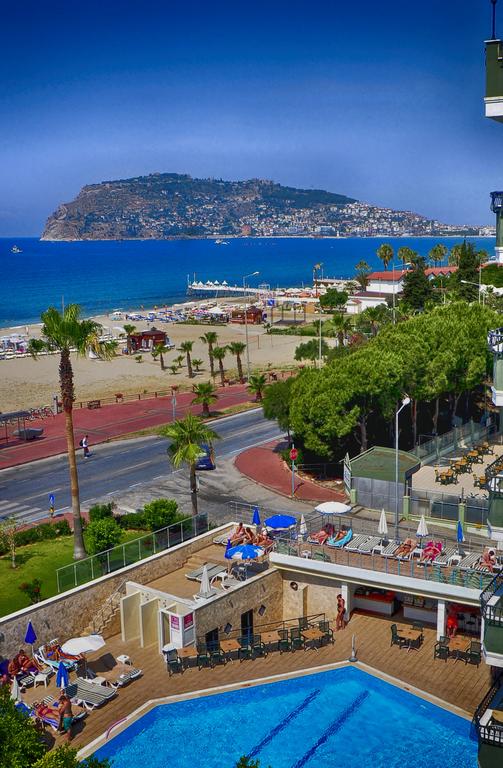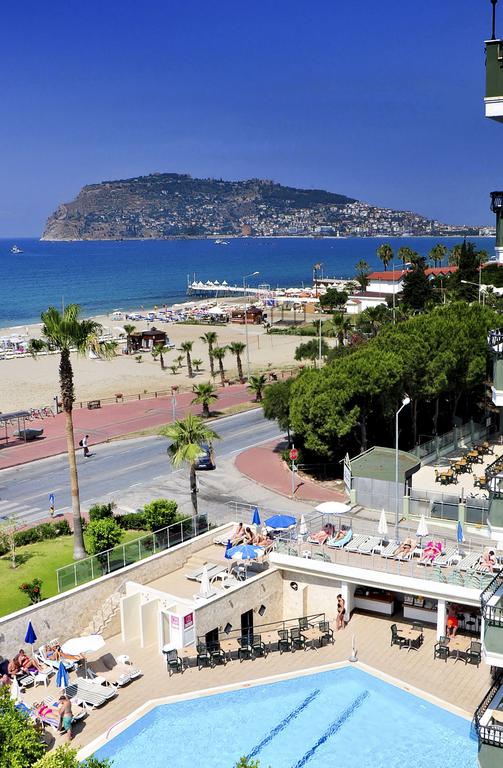 يقع فندق بلو سكاي الشامل كليًا على شاطئ البحر، ويحتوي على شاطئ رملي خاص على طول البحر الأبيض المتوسط، ومطعم واقع على السطح ومطل على شاطئ ألانيا. كما يبعُد مسافة كيلومترين عن وسط مدينة ألانيا.